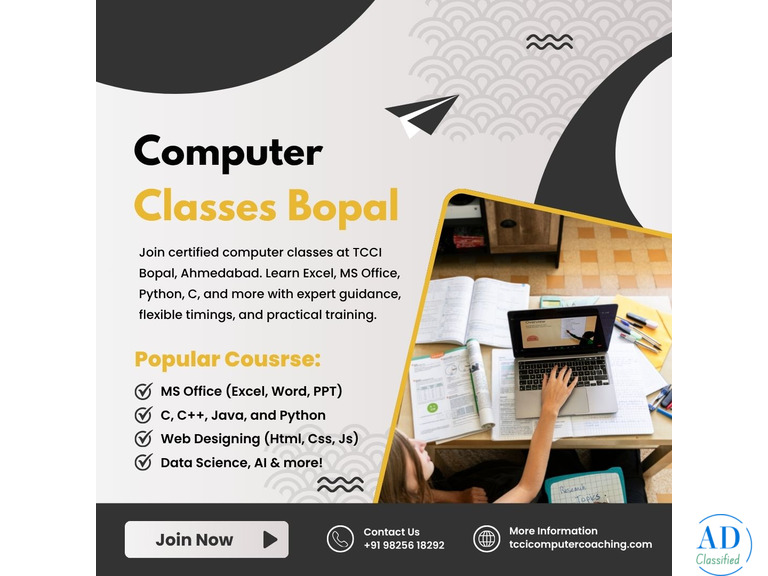 TCCI - Tririd Computer Coaching Institute offers the best computer classes in Bopal, Ahmedabad, designed for students, professionals, and beginners. Our training programs cover essential computer skills including MS Office, Advanced Excel, Internet usage, and programming languages like C, C++, and Python. We also provide training in web designing using HTML and CSS, and offer guidance for final year project development.