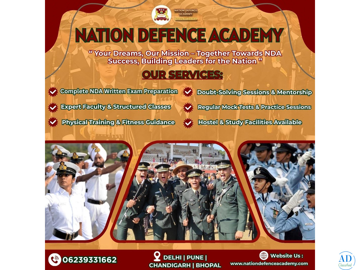 - NDA Coaching with Schooling in ChandigarhCheck with sellerTutoring - Private Lessons Chandīgarh (Chandigarh) 2025/09/19Looking for NDA with Schooling after 10th in Chandigarh? Nation Defence Academy offers a complete schooling and NDA coaching program designed for students who aim to join the armed forces right after their 10th. Our integrated course combines CBSE cu...
