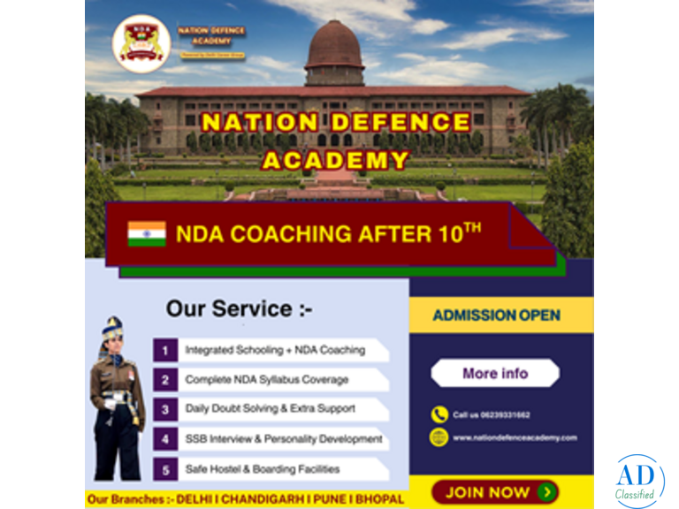 - NDA With Schooling After 10th in ChandigarhCheck with sellerTutoring - Private Lessons Chandīgarh (Chandigarh) 2025/09/25Join Nation Defence Academy for NDA Coaching with Schooling After 10th in Chandigarh and start your defence career early with expert guidance. Our integrated program offers quality academic education along with specialized NDA preparation, physical f...