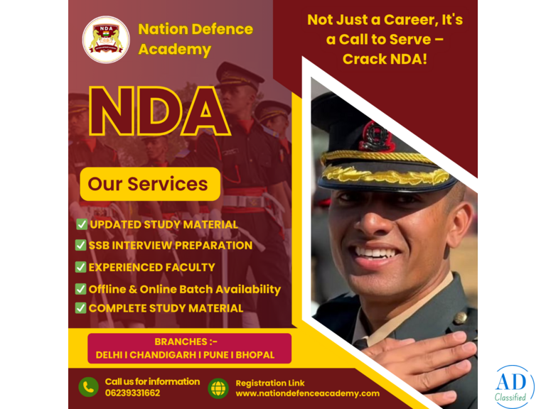 - NDA 1 Year Foundation Program In Pune – Nation Defence AcademyCheck with sellerTutoring - Private Lessons Pune (Maharashtra) 2025/10/10Enroll in the NDA 1 Year Foundation Program In Pune by Nation Defence Academy and start your defence journey with expert guidance. The program focuses on building a strong foundation in Mathematics, English, and General Studies while including da...