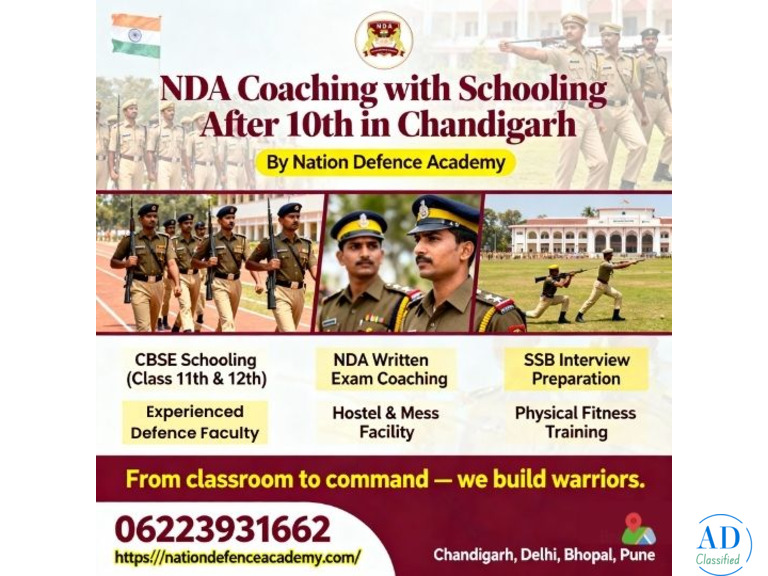 - NDA Coaching with Schooling in ChandigarhCheck with sellerTutoring - Private Lessons Chandīgarh (Chandigarh) 2025/09/19Looking for NDA with Schooling after 10th in Chandigarh? Nation Defence Academy offers a complete schooling and NDA coaching program designed for students who aim to join the armed forces right after their 10th. Our integrated course combines CBSE cu...