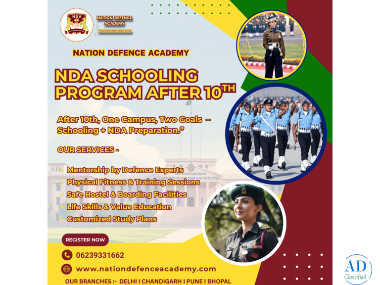 - NDA Coaching with Schooling in ChandigarhCheck with sellerTutoring - Private Lessons Chandīgarh (Chandigarh) 2025/09/19Looking for NDA with Schooling after 10th in Chandigarh? Nation Defence Academy offers a complete schooling and NDA coaching program designed for students who aim to join the armed forces right after their 10th. Our integrated course combines CBSE cu...