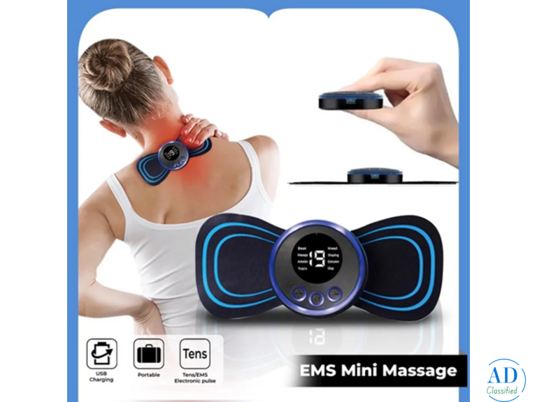 A compact, portable massage device that uses electronic muscle stimulation (EMS) and/or vibration pulses to deliver massage, relieve muscle tension, fatigue, knots and improve circulation. Often shaped like a small pad or “stick” / “patch” that can be applied to various body parts (neck, shoulders, back, legs, arms).