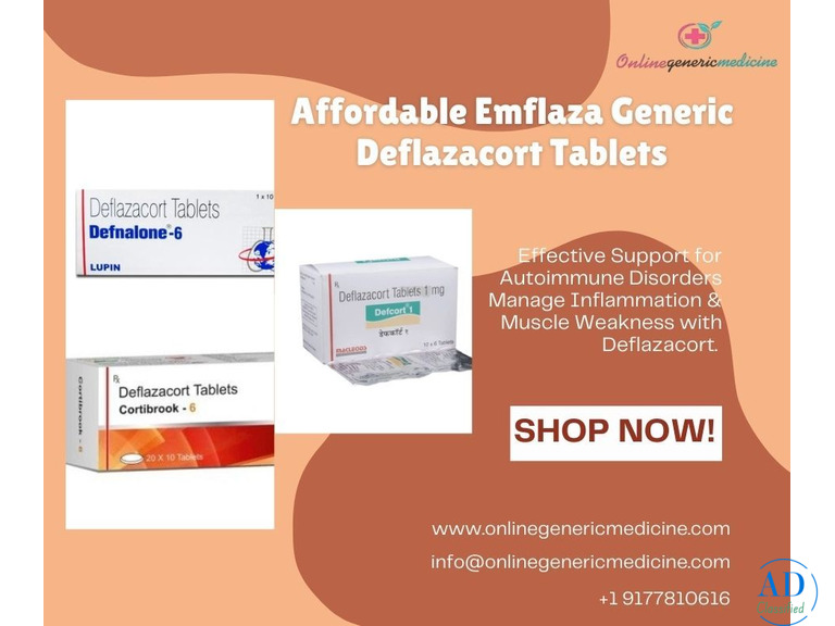 Buy Deflazacort tablets (Emflaza generic) online at OnlineGenericMedicine. Discover Deflazacort tablet uses for inflammation, autoimmune disorders, and muscular dystrophy. Get genuine medicines at affordable prices with safe delivery. OnlineGenericMedicine offers trusted Emflaza alternatives, reliable service, and quality healthcare solutions for your treatment needs.