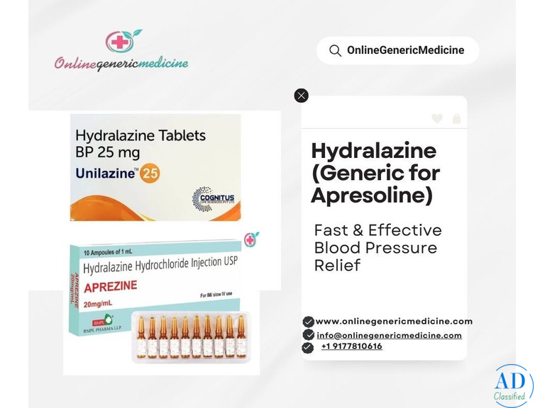 Discover Hydralazine (Apresoline Generic), a trusted medication for managing high blood pressure and improving heart health. Learn in detail about hydralazine uses, recommended hydralazine dosage, and common hydralazine side effects to ensure safe treatment. Hydralazine Hydrochloride (Hydralazine HCL) helps relax blood vessels, lowering pressure and reducing strain on the heart. Choose Hydralazine tablets at onlinegenericmedicine for safe, effective, and affordable access to Apresoline Generic medication online. Order Now!