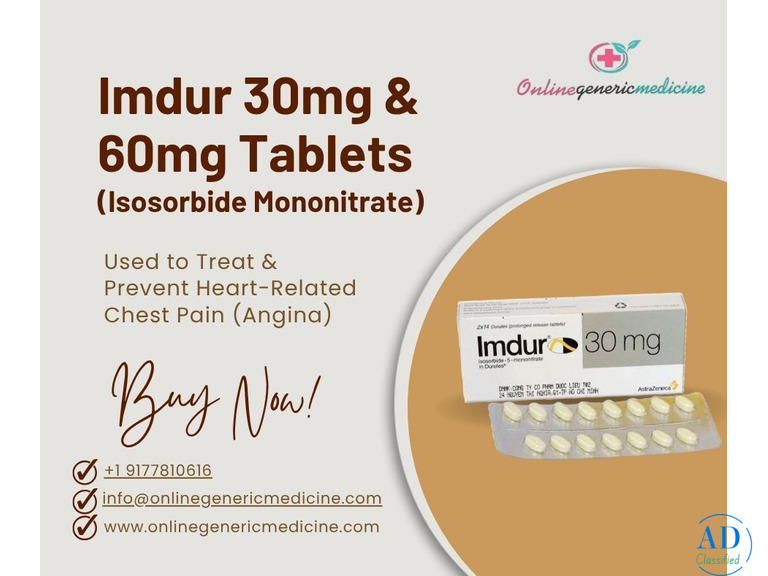Maintain a healthy heart with Imdur 30mg Tablet and Imdur 60mg Tablet, containing Isosorbide Mononitrate, a trusted medication for preventing chest pain (angina). Imdur helps improve blood flow, reduce heart strain, and enhance oxygen supply to the heart muscles. Experience long-lasting relief and effective heart care with this doctor-recommended medicine. Order genuine Imdur Tablets online today at affordable prices, available exclusively from OnlineGenericMedicine. Order Now!