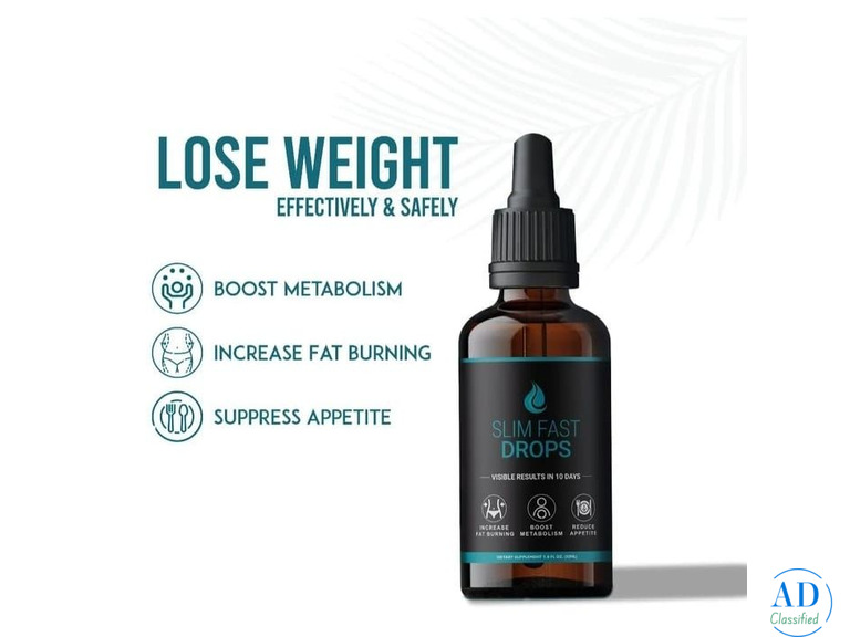 Slim Fast Drops are a herbal weight loss supplement in liquid drop form, designed to support fat burning, reduce appetite, and boost metabolism. The drops are made with natural ingredients like Garcinia Cambogia, Green Tea Extract, Apple Cider Vinegar, Cinnamon, and Senna, which are traditionally used for weight management and digestion.