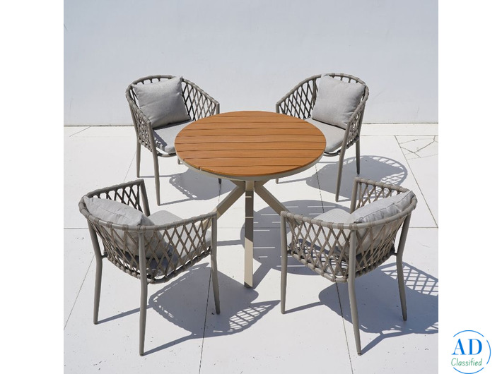 This thoughtfully designed set includes 1 round dining table (90 × 76 cm) and 4 armchairs (each 59 × 62.5 × 77.5 cm), forming a circle of comfort perfect for intimate outdoor gatherings. The dismantlable table features a robust iron top adorned with artificial poly wood slats, offering the rich look of natural wood combined with the all-weather resilience of synthetic material. It resists cracking, fading, and moisture, making it ideal for long-term outdoor use.