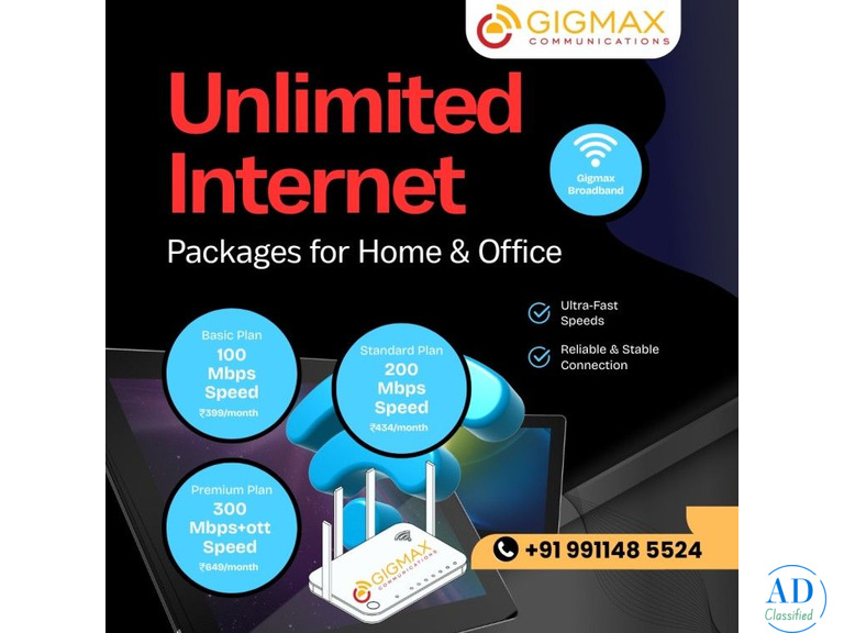 Looking for a reliable and affordable unlimited internet plan for home and office in Faridabad? Gigmax brings you high-speed broadband solutions designed to meet every need—whether it’s smooth streaming for your family or seamless connectivity for your business. With our fiber-backed network, you get ultra-fast speeds, unlimited data, and unbeatable stability in key areas like NIT 3, NIT 4, and NIT 5 Faridabad. Enjoy buffer-free video calls, lag-free gaming, and uninterrupted office work with plans tailored for both residential and corporate users. At Gigmax, we make sure your home stays entertained and your office stays productive, all at cost-effective prices. Plus, with easy installation and dedicated customer support, your experience is always hassle-free. Choose Gigmax and step into the world of unlimited WiFi plans in Faridabad that truly deliver. Stay connected, stay ahead—with Gigmax powering your internet.