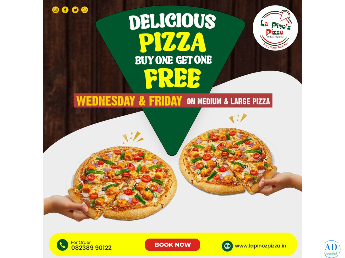 - Late night pizza delivery UlweCheck with sellerRestaurant - Food Service Navi Mumbai (Maharashtra) 2025/08/13BOGO Offer at La Pino’z Pizza Ulwe – Buy One, Get One Free Double the flavor without doubling the price. Buy any medium or large pizza and get another one absolutely free. Perfect for a relaxed evening at home or a fun-filled party night with fri...