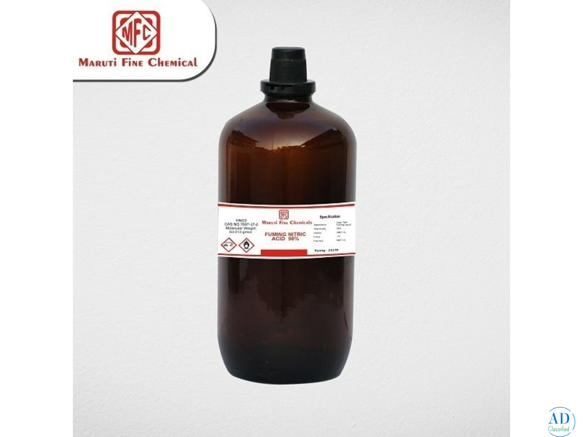 - High-Quality Fuming Sulphuric Acid by Maruti Fine ChemicalsCheck with sellerLegal Mumbai (Maharashtra) 2025/09/08Maruti Fine Chemicals supplies high-quality Nitric acid fuming 98% with consistent purity and reliable performance for industrial and laboratory needs. The product is widely applied in pharmaceuticals, agrochemicals, and advanced chemical formulation...