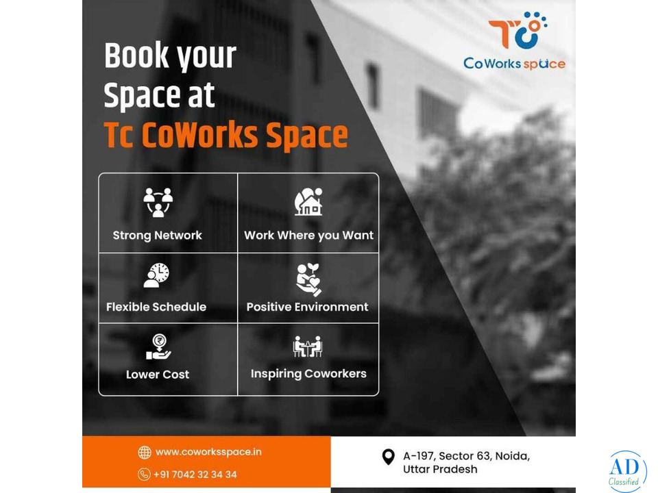 TC CoWorks Space is a company that provides the best private office space in Noida. premium cabins, high-speed internet, meeting rooms, and flexible plans that are tailored to startups, freelancers, and growing businesses. Our contemporary workstations are designed with ergonomic chairs, 24 hours security system and group work atmosphere to ensure that you remain productive. You should also find the ideal balance of functionality and comfort when you require a private cabin to concentrate on work or a professional set-up to impress your clients. Get a stress free working environment and all necessities at a single roof.