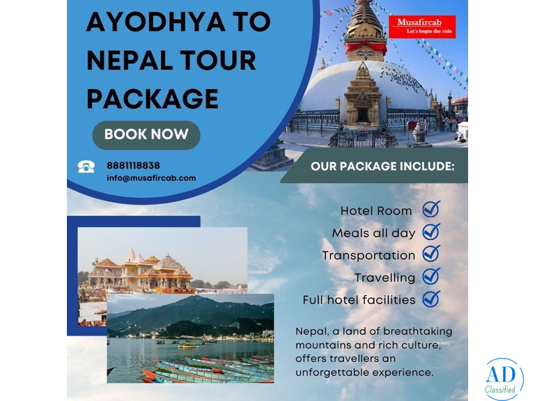 More than just a vacation, the Ayodhya to Nepal Tour Package is a soulful journey into divine landscapes, sacred temples, and the majestic Himalayas. Begin your adventure from the holy city of Ayodhya and travel to Nepal, where every destination tells a story of faith, culture, and natural beauty. Your journey is made seamless with private cabs, expert guides, and cosy hotels, ensuring both comfort and convenience. With Musafircab as your trusted companion, you don’t just visit destinations—you experience the soul of Nepal, where spirituality, tradition, and nature come together in one unforgettable journey.