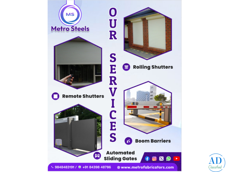 Looking for professional steel fabrication services in Guntur? Metro Fabricators delivers top-quality solutions for homes, offices, and industries. We specialize in automatic rolling shutters, remote control rolling shutters, sliding gates, and boom barriers with precision design and durable finish. Our expert team ensures timely installation and affordable pricing. Visit or call us today for a free consultation.