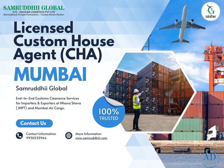Licensed Custom House Agent (CHA) Mumbai specializing in fast and reliable Customs Clearance at JNPT (Nhava Sheva) and Mumbai Air Cargo. Samruddhii Global, a trusted Custom House Agent Mumbai, handles all your import and export documentation, duty calculations, and cargo release with speed and compliance across India. Ensure smooth, hassle-free logistics.
